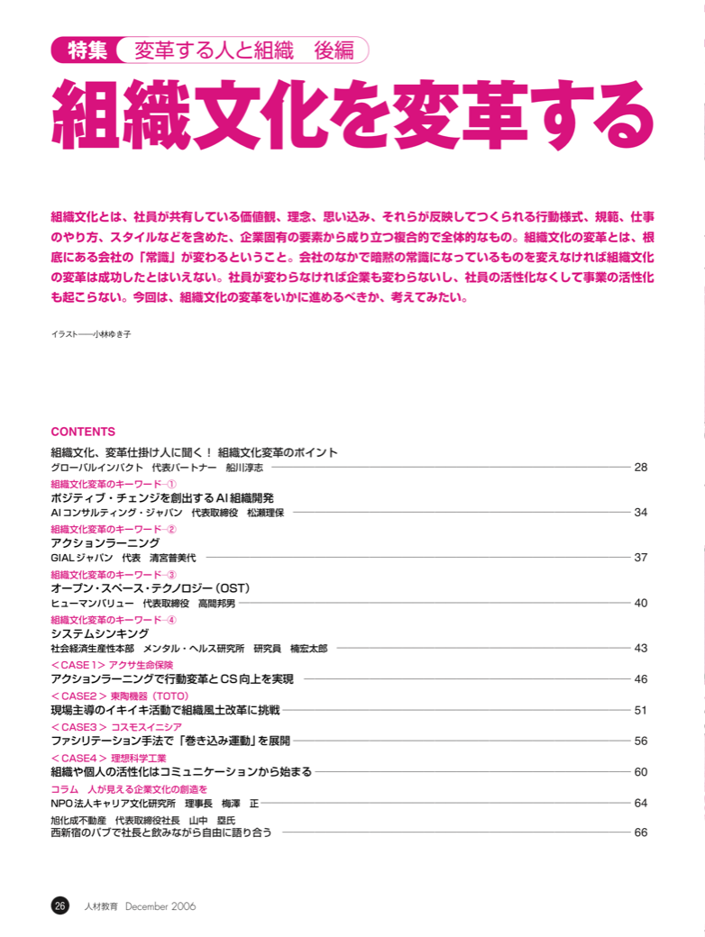 組織文化とは、社員が共有している価値観、理念、思い込み、それらが反映してつくられる行動様式、規範、仕事のやり方、スタイルなどを含めた、企業固有の要素から成り立つ複合的で全体的なもの。組織文化の変革とは、根底にある会社の「常識」が変わるということ。会社のなかで暗黙の常識になっているものを変えなければ組織文化の変革は成功したとはいえない。社員が変わらなければ企業も変わらないし、社員の活性化なくして事業の活性化も起こらない。今回は、組織文化の変革をいかに進めるべきか、考えてみたい。