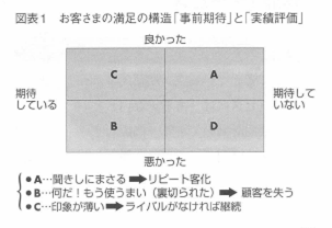 図表1のマトリックスをご覧いただきたい。顧客満足の構造を「事前期待」と「実績評価」とで兒たものだが、これからわかることは、たとえ顧客が期待しているサービスを提供できたとしても、それは当たり前のことであって(C)、むしろできなければ不満として残ってしまうし、場合によっては顧客を失いかねない状況が生じることもある(B)。それよりも、こうしてもらえたら嬉しい、あるいは予想もしなかったようなサービスが享受できたとしたら、その満足は他の比ではないということなのだ(A)。千葉夷隅GC は、まさにこの「A」という事前期待を上回るサービスを提供できている、実は全国でもたぐいまれなゴルフ塲である。