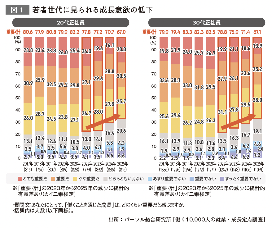 深刻なのは、若手正社員の成長志向の減少だ。パーソル総合研究所の経年調査によると、特にコロナ禍を過ぎた2022年以降、仕事を通じた成長や学びに対する意欲は悪化傾向にある(図1)。パーソル総合研究所主席研究員の小林祐児氏は、この現象を「ラーニング・リセッション(学習恐慌)」とよび、危機感を募らせる。