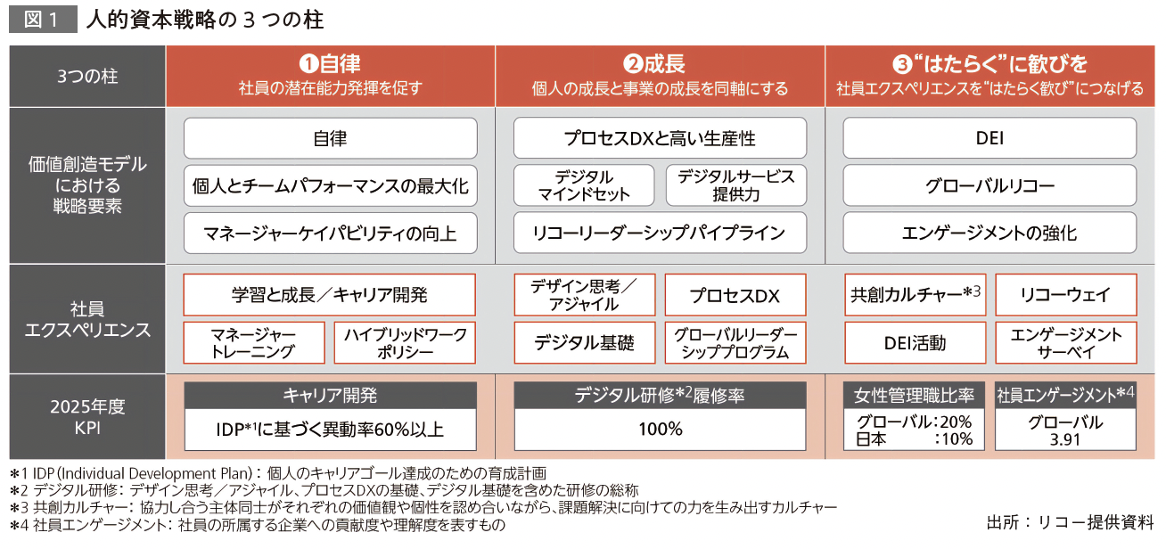 こうした背景から、同社は人的資本戦略の3つの柱の1つに「自律」を掲げ、自律的なキャリア形成の支援など、社員の潜在能力発揮を促す施策を展開している(図1)。