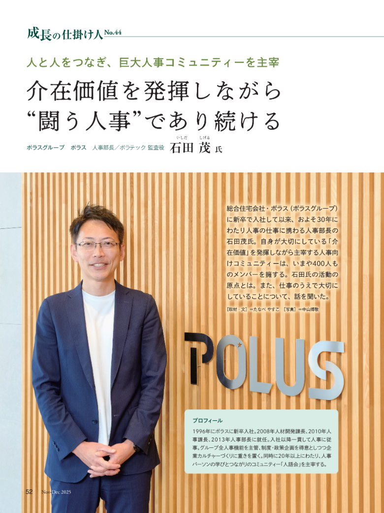 総合住宅会社・ポラス(ポラスグループ)に新卒で入社して以来、およそ30年にわたり人事の仕事に携わる人事部長の石田茂氏。自身が大切にしている「介在価値」を発揮しながら主宰する人事向けコミュニティーは、いまや400人ものメンバーを擁する。石田氏の活動の原点とは。また、仕事のうえで大切にしていることについて、話を聞いた。
