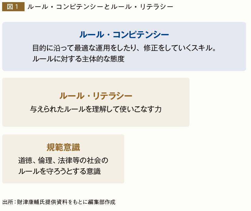 「ルール・リテラシーは与えられたルールを理解して使いこなす力、そして規範意識は、社会のルールを守ろうとする意識のことです。ルールを見直すにはまずルールを理解する必要があるので、前提としてルール・リテラシーや規範意識があり、その上にルール・コンピテンシーが加わるという構造です(図1)」