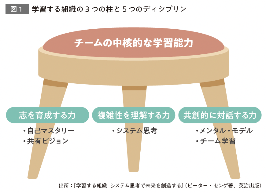 学習する組織の構造が図1である。椅子の座面が組織における中核的な学習能力を象徴し、それを「志を育成する力」「複雑性を理解する力」「共創的に対話する力」の3本柱が支えている。そして、その3本柱を形づくるのが、「自己マスタリー」「共有ビジョン」「システム思考」「メンタル・モデル」「チーム学習」という5つのディシプリン。ディシプリンとは、学びのテーマや探究すべき領域を意味する。