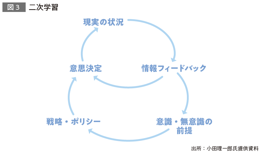 「計画を立てて実行し、結果が計画どおりでなければ計画自体を見直して改善する。PDCAはもっとも基本的な学習で、学習理論の用語では『一次学習』とよばれます。しかし、計画の前提となる『こうすればこういう結果が出る』という因果関係の考え方そのものが間違っていたら、どうでしょうか。いくらサイクルを回しても、求める結果が出るわけがありませんよね。既存事業の経験が長い人が、新しいことにチャレンジしようとして、うまくいかないのもそう。既存事業では当たり前だった思考の枠組みや無意識の前提に気がつかず、誤った判断や行動を重ねていることが多いのです。メンタル・モデルは効率的な思考を可能にする半面、バイアスや思い込みを生み、現実をありのままに受け止めたり、変化の本質を見極めたりすることを妨げる障害にもなりかねません。そこで学習する組織では、自らのメンタル・モデルそのものも見つめ直し、バイアスを取り払って、より適切な前提の再構築を目指します。これがより高次の学習である『二次学習』(図3)です」