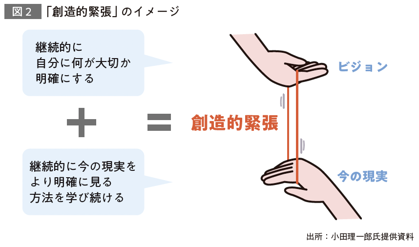 「自己マスタリーのワークショップなどで、20、30代のビジネスパーソンに話を聞くと、『私のビジョンはこれです』と具体的に答えられる人はまだ少ないです。自分のなりたい姿が明確になって初めて、そのビジョンと今の現実とのギャップに“創造的な緊張”(図2)が生じ、学びたい、成長したいという欲求が表に出てくるもの。ところが、夢やビジョンを描くのもスキルなので、経験や訓練が乏しいと強く描けないんです。なぜ、そうなってしまうのでしょうか。そもそも日本社会は、自分の夢を語ったり、追いかけたりすることに眉をひそめるネガティブな風潮に、いまだに毒されています。子どものころから、将来の夢や目標さえ大人に評価されて育ち、社会へ出たら出たで組織の同調圧力にしばられてしまう。無難な行動や曖昧な選択が習慣化されるのも無理はありません。上司や人事部に『あなたのキャリアビジョンは? 』なんて尋ねられると、評価の対象にされるかも……と、かえって不安に感じる人が多いのも当然でしょう」