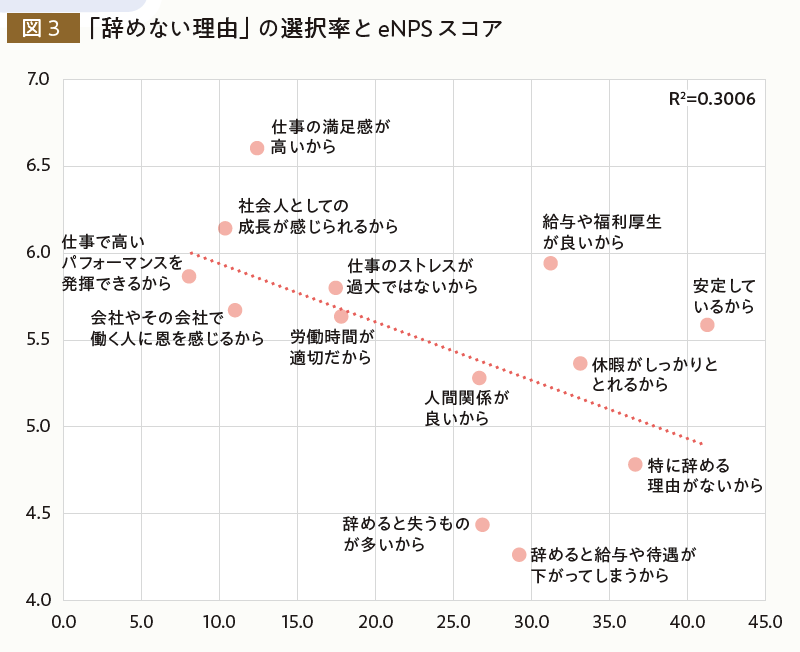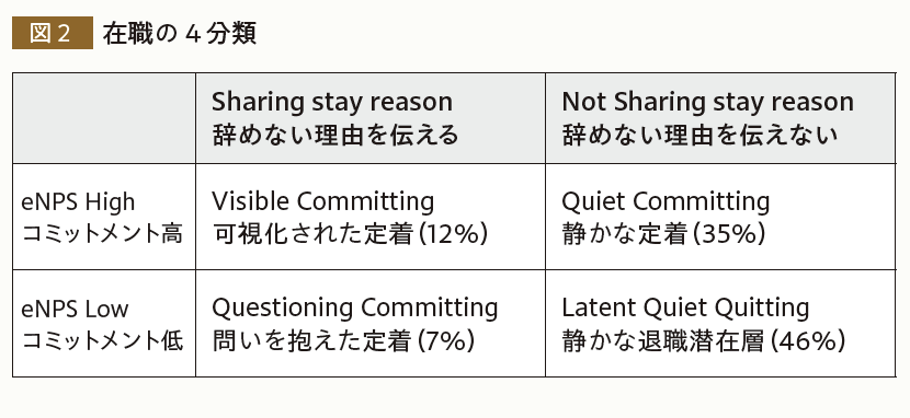 ちなみに、図2の4分類の左下は、辞めない理由を言葉にして伝えてはいるが、その内容がポジティブではないためにeNPSが低く、高いコミットメントを持てないと推測されるグループだ。納得して定着している状態ではないので、「問いを抱えた定着」とよばれるが、割合は7%とそれほど多くない。